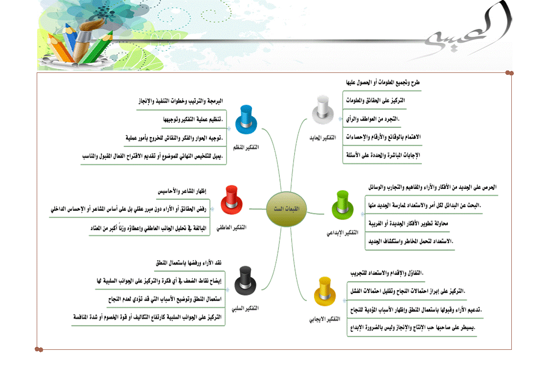 نماذج مختلفة من التفكير وأعطى كل قبعة لونا يعكس طبيعة التفكير المستخدم. ماذا عن ترتيب استخدام القبعات ماذا عن الوقت المخصص لكل قبعة. أن الغرض الأول من معرفة القبعات الست هي تحديد الأدوار ومن أهم معوقات التفكير الصحيح هو الدفاع عن الأنا وتتيح لنا القبعات أن نقول آرائنا دون أن نجرحها فإن ارتداء زي المهرج يسمح لك بتمثيل.