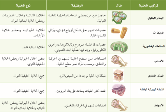 ولكل عضية تركيب ووظيفة مميزان. قبل ان نترك الكلام عن الخلية يجب ان نعلم السمات المشتركة للكائنات الحية والتى تمثلها الخلية النباتية التى نحن فى صدد دراستها فنج ان اهم تلك الصفات هى. تبادل المواد عبر الغشاء الخلوي. فجوة عصارية مركزية كبيرة وحدة تخزين مملوءة بالماء م حاطة بغشاء يعرف باسم.