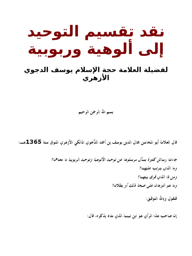 وت شك ل هذه الأقسام الثلاثة الإيمان بالله تعالى والعلاقة بين هذه الأقسام تكاملي ة ولا ي جزئ الإيمان ببعضها عن الآخر فلا يصح توحيد الربوبية من دون توحيد الأ لوهية كما أن ه لا يصح توحيد الأ لوهية من غير توحيد الربوبية فأي خلل في أي قسم من هذه الأقسام يؤدي إلى خلل في. بحث عن بحث بعنوان دلائل توحيد الربوبية جاهز للتحميل شاهد البي دي اف أولا. بحث عن السيدة مريم العذراء. ما هي أقسام التوحيد.
